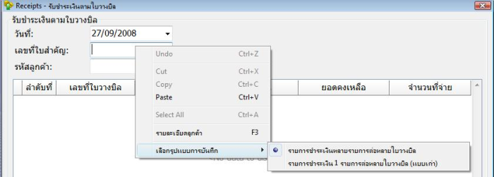 ในที่นี้ให้เลือก บันทึกรายการรับชำระเงินตามใบวางบิล เหตุผลก็คือ โดยทั่วไปการรับชำระเงินจากลูกหนี้ร้านค้า ต้องมีการวางบิลล่วงหน้า เพื่อนัดรับชำระเงิน ดังนั้น การออกใบวางบิลจึงมีความจำเป็นสำหรับกิจการ เพราะในแต่ละเดือนอาจมีรายการขายสินค้าหลายๆครั้ง ซึ่งถ้ามีการรวบรวมไว้ในใบวางบิลใบเดียว ก็จะสะดวกต่อการรับชำระเงิน