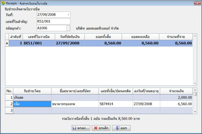 7. จะสังเกตุเห็นว่าตอนนี้ ยอดทั้งสิ้น กับ จำนวนเงินที่จ่าย จะเท่ากัน