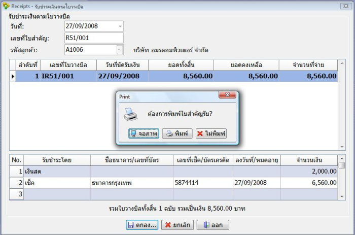 กด [ตกลง] หน้าจอจะแสดงเพื่อให้เลือกว่า “ต้องการพิมพ์ใบวางบิล ?”