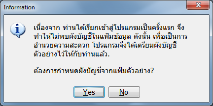 โดยปกติก่อนเรียกเข้าโปรแกรมครั้งแรก จะมีการถามว่าต้องการสร้างผังบัญชีอัตโนมัติ