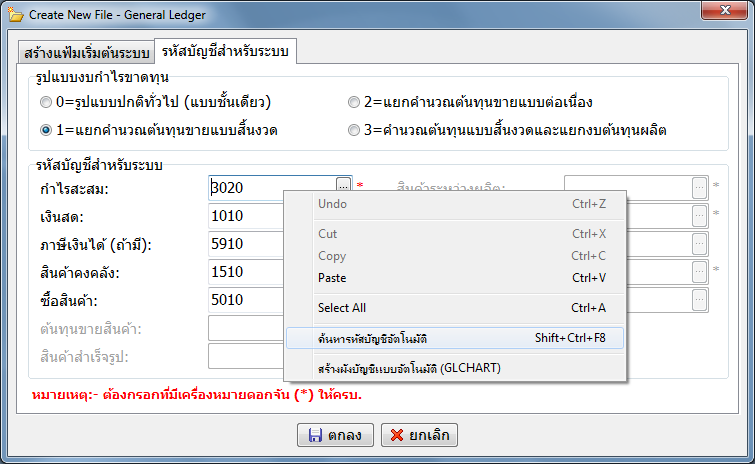 จากนั้นเมื่อเรียกเข้าโปรแกรมจะให้สร้างรหัสบัญชีสำหรับระบบ สามารถคลิกขวา เลือก ค้นหารหัสบัญชีอัตโนมัติ โปรแกรมจะทำการนำรหัสบัญชีมาใส่ให้โดยอัตโนมัติ