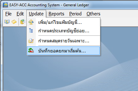 3. หลังจากสร้างผังบัญชีเรียบร้อยแล้ว ขั้นตอนต่อไปคือนำยอดยกมา มาบันทึกเข้าไปในโปรแกรม ซึ่งการนำยอดยกมา มาบันทึกนั้นจะทำเพียงครั้งแรกที่เริ่มใช้โปรแกรมเท่านั้น ซึ่งท่านสามารถบันทึกได้ที่หัวข้อ Update / บันทึกยอดยกมาเริ่มต้น