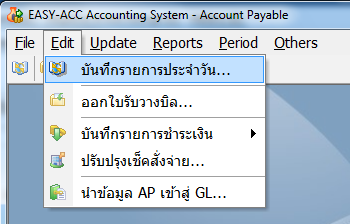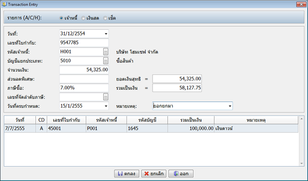 การบันทึกรายการยอดยกมาในโปรแกรมเจ้าหนี้และค่าใช้จ่าย/ลูกหนี้และรายได้ สามารถเข้าไปที่ Edit/บันทึกรายการประจำวัน โดยเลือกหัวรายการเป็นเจ้าหนี้ หรือลูกหนี้ (ตามประเภทของโปรแกรม) โดยใส่วันที่ติดต่อเป็น วันที่สุดท้ายของงวดบัญชีที่ตรวจยอดออกมาได้ โดยกำหนดเป็น 31/12/xx (xx= ปีที่แล้วก่อนปีปัจจุบัน เช่นต้องการบันทึกยอดยกมาของปี55 ให้ใส่เป็น 31/12/54 เป็นต้น)