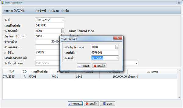 โดยมีส่วนที่สำคัญ คือ เลขที่ใบกำกับนั้น สามารถนำใบกำกับคงค้างแต่ละใบมาบันทึกก็ได้หรือจะนำยอดรวมทั้งหมดที่ค้างชำระของรหัสเจ้าหนี้,ลูกหนี้แต่ละรายมาบันทึกเป็นใบกำกับเดียวก็ได้ (วิธีนี้จะไม่ทราบรายละเอียดแต่ละใบ เช่นเดียวกับกรณีของเช็ค คือ เลือกหัวรายการเป็นเช็ค ส่วนรายละเอียดเหมือนกัน เพียงแต่จะต้องกรอกรายละเอียดเกี่ยวกับเช็คด้วย คือ รหัสบัญชี ธนาคาร เลขที่เช็คและเช็คลงวันที่ เพื่อรอการปรับปรุงเช็คต่อไป