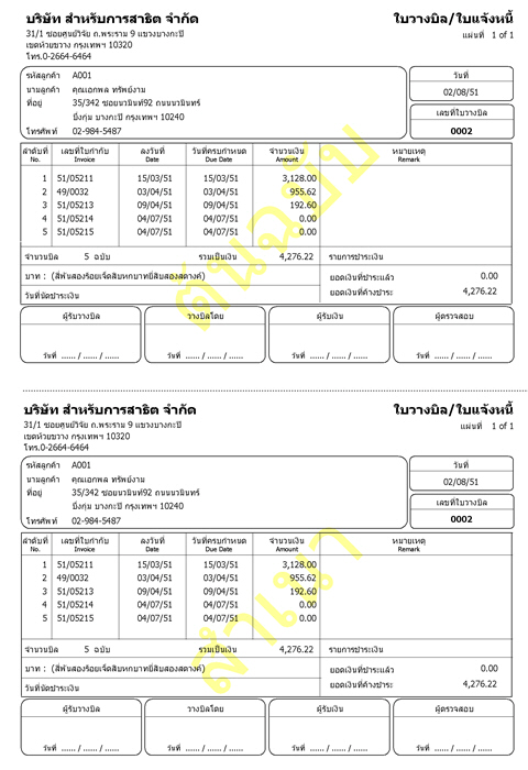 ใบรับวางบิล (สำหรับโปรแกรมเจ้าหนี้) ในแบบครึ่งใบ ท่อนบนจะเป็นต้นฉบับ และท่อนล่างจะเป็นสำเนา สำหรับเครื่องพิมพ์แบบ Laser และ Inkjet เท่านั้น เพราะขนาดกระดาษที่กำหนดจะเป็นขนาด A4 ถ้าพิมพ์ลงกระดาษต่อเนื่องจะไม่ลงกระดาษพอดี
